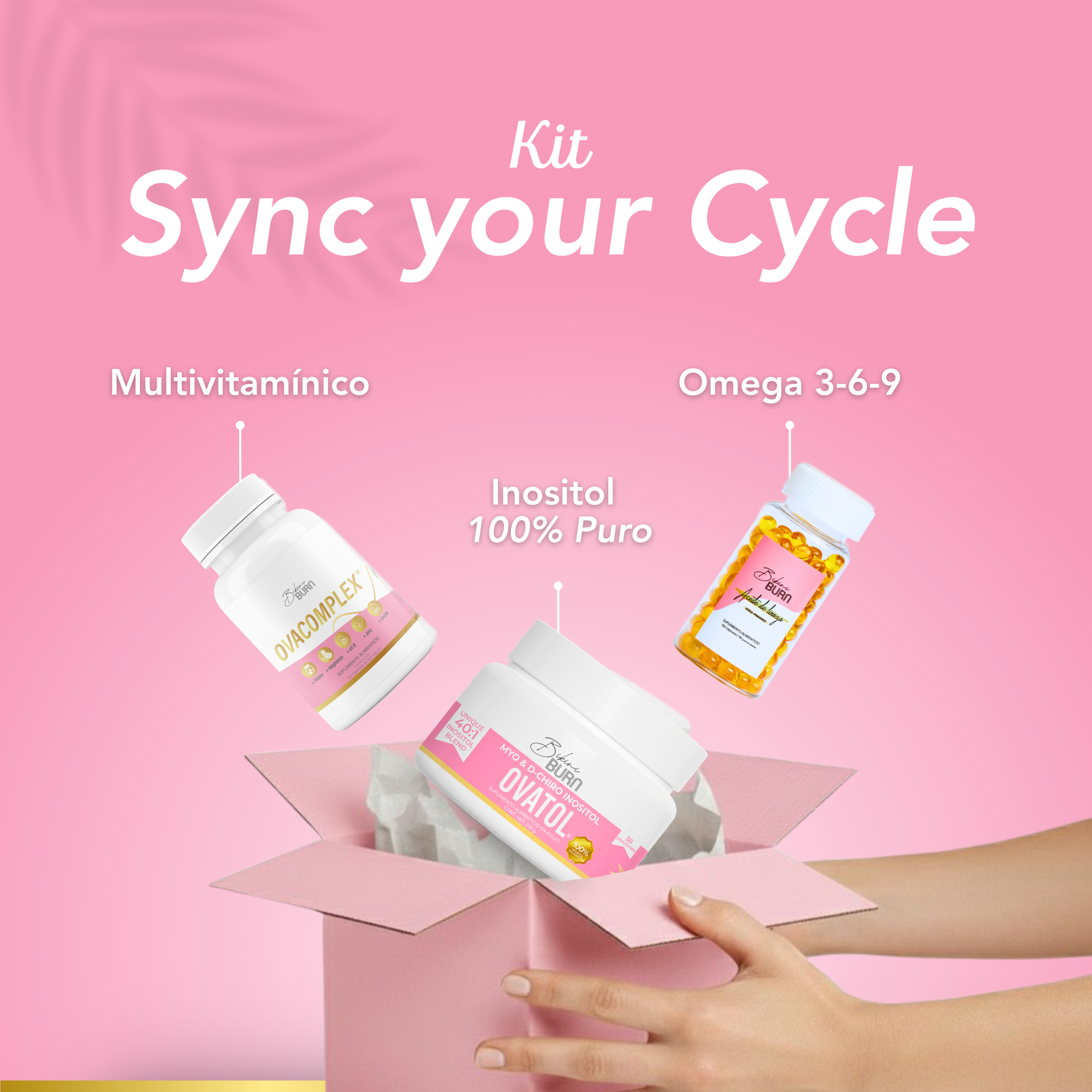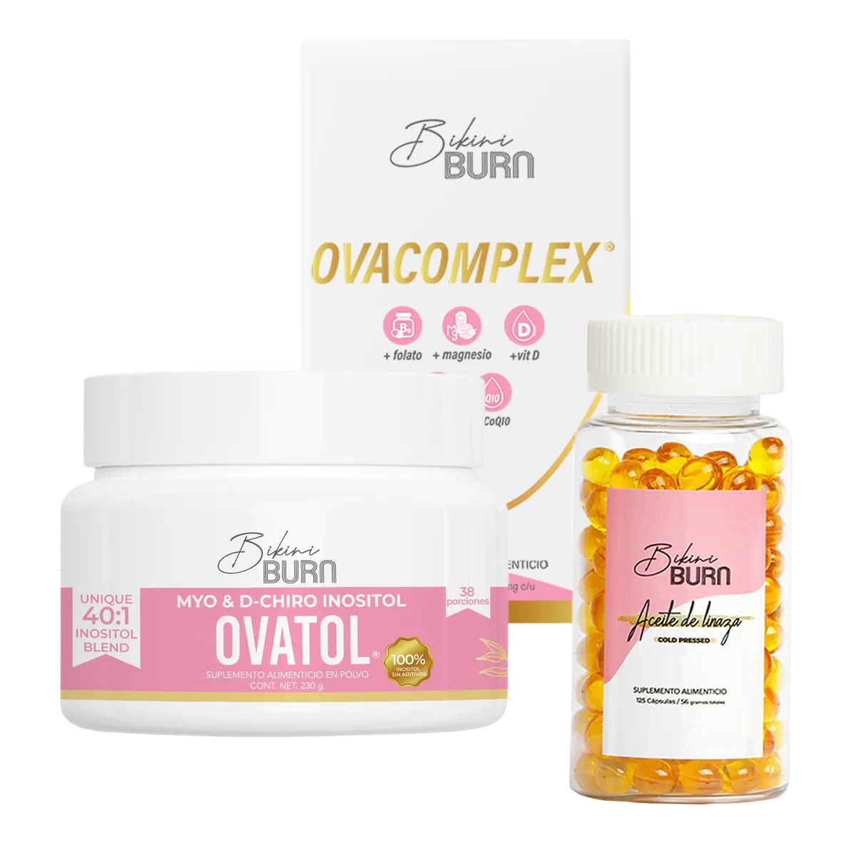Este kit fue creado para acompañarte en cada etapa del mes con tres fórmulas limpias que se complementan entre sí: Ovatol Inositol 40:1, Ovacomplex con Berberina, Magnesio, Zinc, Vitamina D3, Folato y CoQ10, y Aceite de Linaza Omega 3-6-9 Vegano.